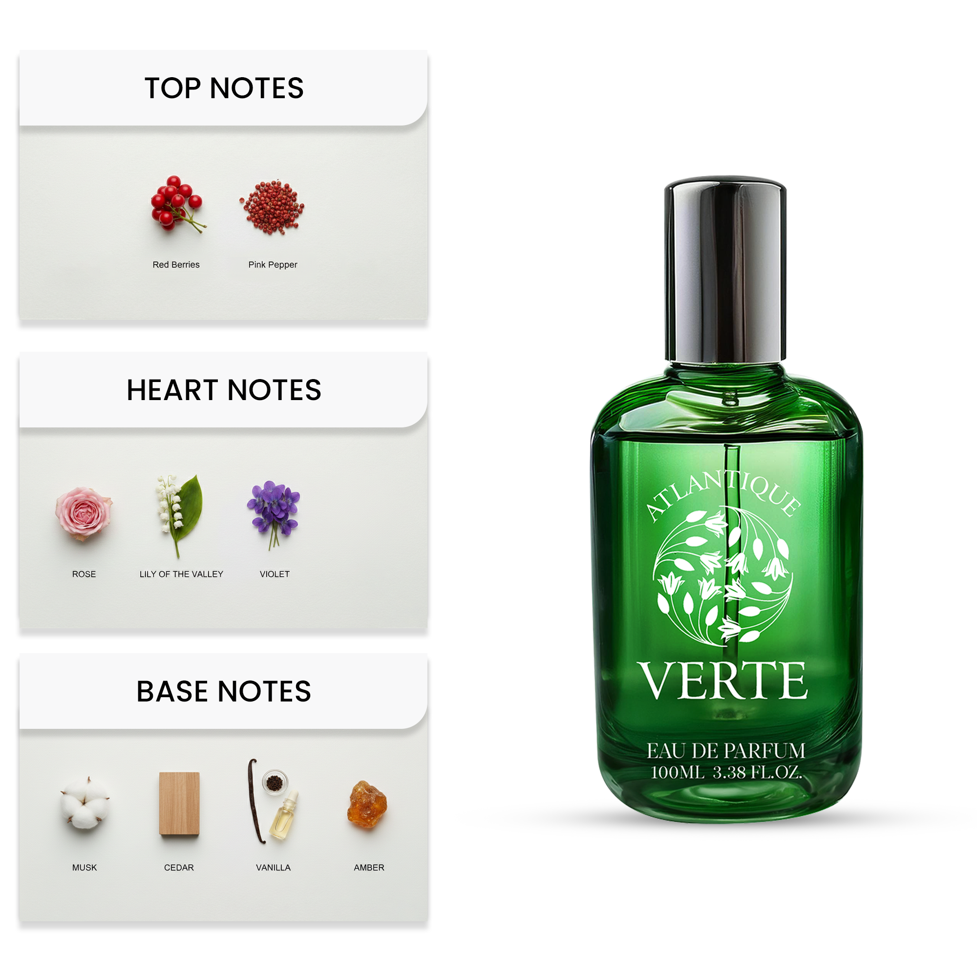 From the first spritz, a vibrant burst of fresh musk, sweet citrus, and aromatic accords awakens the senses. The heart reveals a dynamic contrast of fresh and warm spices, creamy vanilla, and succulent fruity notes as the fragrance unfolds. It adds richness and complexity to the composition.